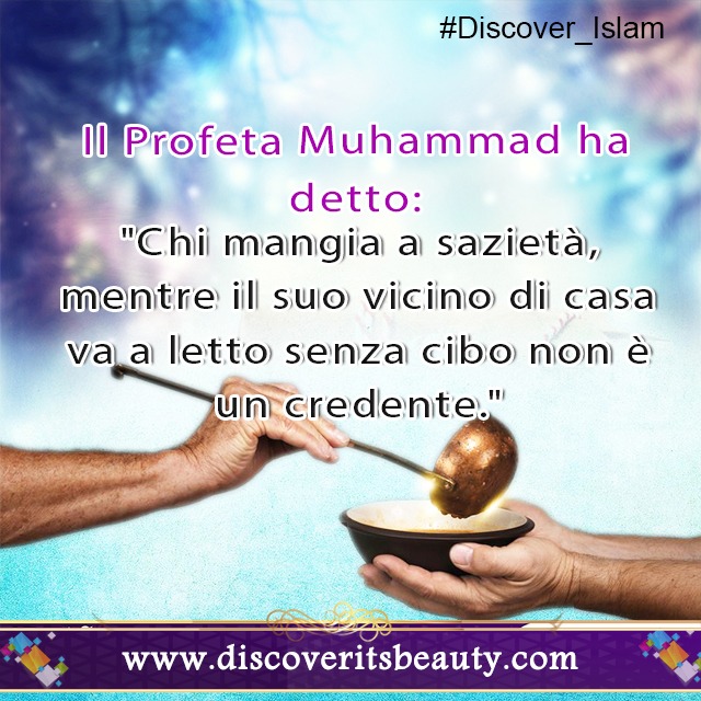 Il Profeta Muhammad ha detto: "Chi mangia a sazietà, mentre il suo vicino di casa va a letto senza cibo non è un credente."