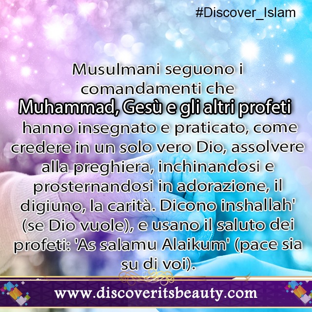 I Musulmani seguono i comandamenti che Muhammad, Gesù e gli altri profeti hanno insegnato e praticato, come credere in un solo vero Dio, assolvere alla preghiera, inchinandosi e prosternandosi in adorazione, digiunare, e dare la carità. Dire inshallah' (se Dio vuole), e usano il saluto dei profeti: 'As salamu Alaikum' (pace sia su di voi).