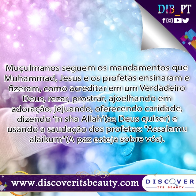 105. Muçulmanos seguem os mandamentos que Muhammad, Jesus e os profetas ensinaram e fizeram, como acreditar em um Verdadeiro Deus, rezar, prostrar, ajoelhando em adoração, jejuando, oferecendo caridade, dizendo 'in sha Allah'(se Deus quiser) e usando a saudação dos profetas: "Assalamu alaikum"(A paz esteja sobre vós).